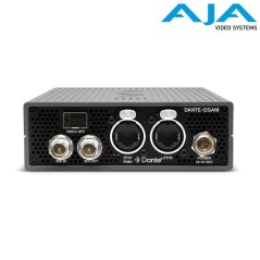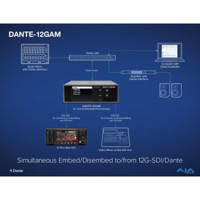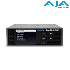 aThe AJA DANTE-12GAM is a high-performance Audio over IP (AoIP) converter specifically designed to facilitate the seamless connection between SDI video and Dante audio ecosystems. This compact device is capable of embedding audio from a Dante network into an SDI video signal and, conversely, de-embedding audio from an SDI signal for transmission over a Dante network. Beyond its primary Dante functionality, the DANTE-12GAM also supports other key IP audio standards, including AES67 and SMPTE ST 2110-30. This multi-standard compatibility enhances the device's interoperability, allowing it to integrate with a wider range of IP audio systems and providing a degree of future-proofing as the industry continues to evolve.