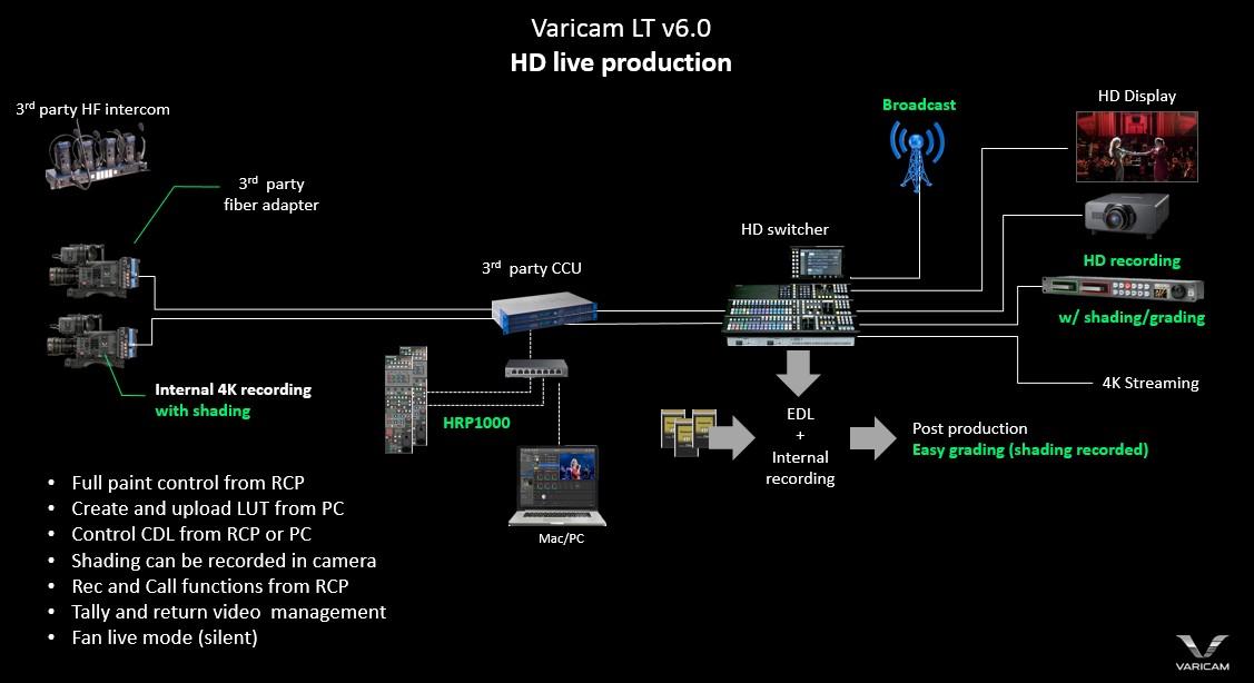 It is also possible to use this VariCam LT as a live and "fake live" production camera for concerts, events, TV programmes and corporate productions. For live multi-camera productions, you benefit from the greater control of the RCP, which gives you full colour correction capabilities. On the other hand, when it comes to "fake live" operators and filmmakers can benefit from 4K multi-camera capture via the internal P2 recording, with final colour grading in post-production.