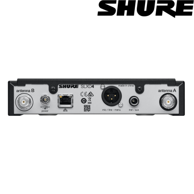 The SLXD4 receiver, fully metal and rack-mountable, features an intuitive LCD interface with RF level indicators, battery status, and audio output. It provides 60 dB gain control and both XLR and 1/4" TRS outputs. Additional features include automatic frequency scanning and IR synchronization, making it easy to pair the transmitter and receiver quickly.