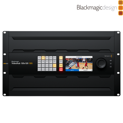 The Blackmagic Videohub 120x120 12G is an advanced video matrix switcher using 12G SDI technology that allows simultaneous, latency-free distribution of all types of video signals in a wide range of resolutions. Includes integrated control panel with LCD display, metal rotary knob and external control program.