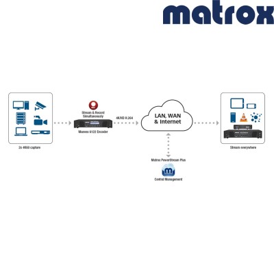 El Matrox Maevex 6122 es un codificador HDMI que permite capturar, codificar, transmitir y grabar simultáneamente dos señales 4K60 con passthrough de latencia cero. Este dispositivo soporta múltiples protocolos de streaming, incluyendo SRT y HLS en el propio equipo, lo que facilita transmisiones seguras y confiables tanto locales como globales. Cuenta con dos puertos Gigabit Ethernet para streaming dual o para separar las redes de control y datos de vídeo. Incluye el SDK Maevex para facilitar la integración y personalización con PowerStream Plus.