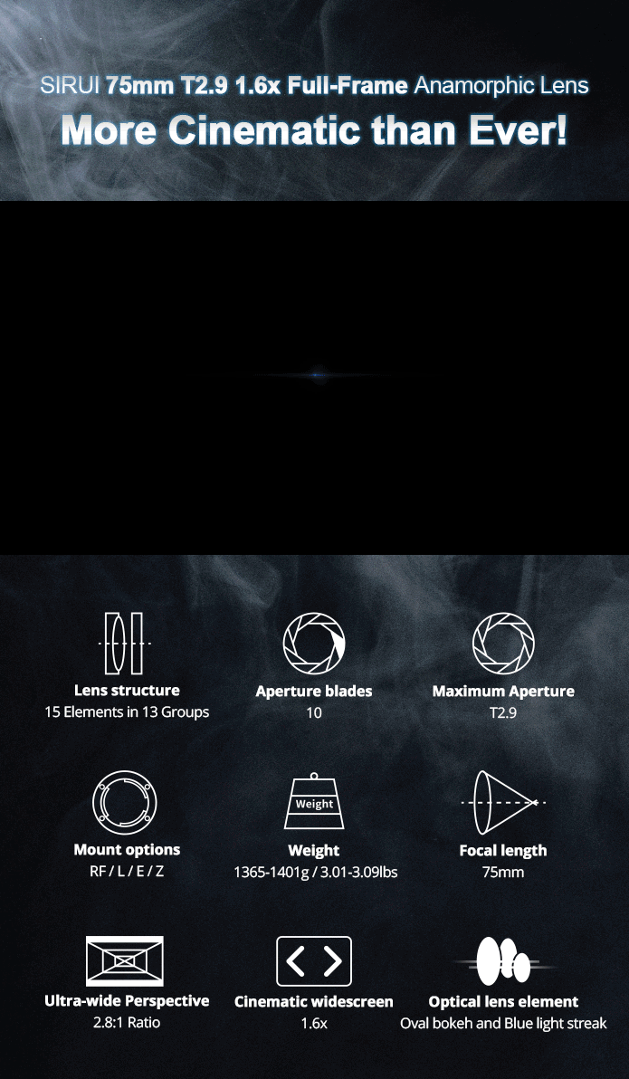 Esta lente anamórfica tiene un factor de compresión de 1,6x, se comporta como un 46mm horizontalmente mientras conserva el FOV vertical de un 75mm, adecuado para capturar primeros planos y sujetos distantes. Este objetivo Sirui permite que la cámara vea bien hacia la izquierda y hacia la derecha, lo que deja a los cineastas más espacio para la composición.