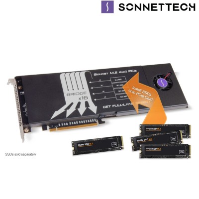 La tarjeta Sonnet M.2 4x4 Silent PCIe permite montar cuatro unidades SSD NVMe en una única ranura de tarjeta PCIe x16 y combinar sus capacidades, para obtener un rendimiento superior. Para flujos de trabajo profesionales, la capacidad de almacenamiento y la velocidad de transmisión son fundamentales. Los SSD M.2 NVMe PCIe ofrecen un gran rendimiento pero, es necesario combinar varios para obtener grandes capacidades de almacenamiento. La tarjeta Sonnet M.2 4x4 Silent es una tarjeta PCIe 3.0 de altura y longitud completas con 16 carriles (interfaz x16), diseñada para dedicar cuatro carriles de ancho de bandoa PCIe 3.0 a cada SSD. No necesita una placa base específica para funcionar, ni unidades SSD concretas para admitir funciones RAID. Basta contar con un sistema de expansión PCIe de Sonnet o con una ranura PCIe libre, para poder añadir hasta 4 SSD a ordenadores Mac, Windows o Linux.