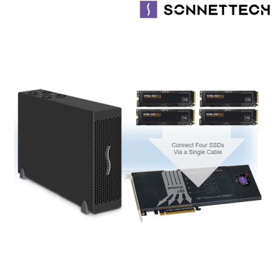 Sonnet ha diseñado la tarjeta M.2 4x4 PCIe con una solución de refrigeración personalizada que incorpora varios componentes. Entre ellos, un disipador térmico y un ventilador inteligente que controla la temperatura y gira sólo cuando y tan rápido como sea necesario para minimizar el ruido audible. Juntos, permiten que las unidades SSD funcionen durante periodos prolongados -sobre todo durante transferencias de archivos de gran tamaño- sin que se produzca una ralentización térmica del rendimiento de las unidades SSD, un problema al que se enfrentan los productos de la competencia.