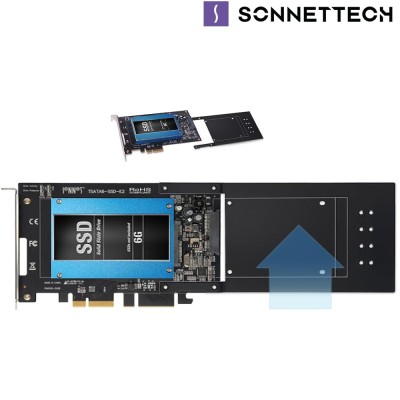 La tarjeta Sonnet Tempo SSD es una solución diseñada para mejorar significativamente la velocidad de almacenamiento en sistemas Mac Pro, PCs de escritorio y cajas de expansión. Esta tarjeta permite montar uno o dos SSDs SATA de 2.5 pulgadas, ofreciendo velocidades de transferencia de hasta 660 MB/s. La interfaz PCIe 2.0 x2 y el controlador SATA de 6 Gb/s garantizan un rendimiento óptimo, compatible con configuraciones RAID en macOS y Windows, habilitando el arranque desde las unidades conectadas. Su diseño modular permite añadir un segundo SSD mediante una bandeja de ampliación incluida, aumentando la capacidad de almacenamiento y la flexibilidad en la configuración del sistema. La tarjeta Sonnet Tempo SSD se distingue, además, por su compatibilidad AHCI, que elimina la necesidad de controladores adicionales, y su soporte para el monitoreo de salud de las unidades a través de S.M.A.R.T.